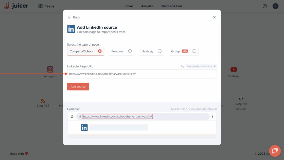 - Choose the type of LinkedIn source you want to embed: Company/School (requires a full page URL to embed LinkedIn company feed), Personal (requires a profile name to to embed LinkedIn profile feed), Hashtag (requires the hashtag only), or Group (requires Group URL).
