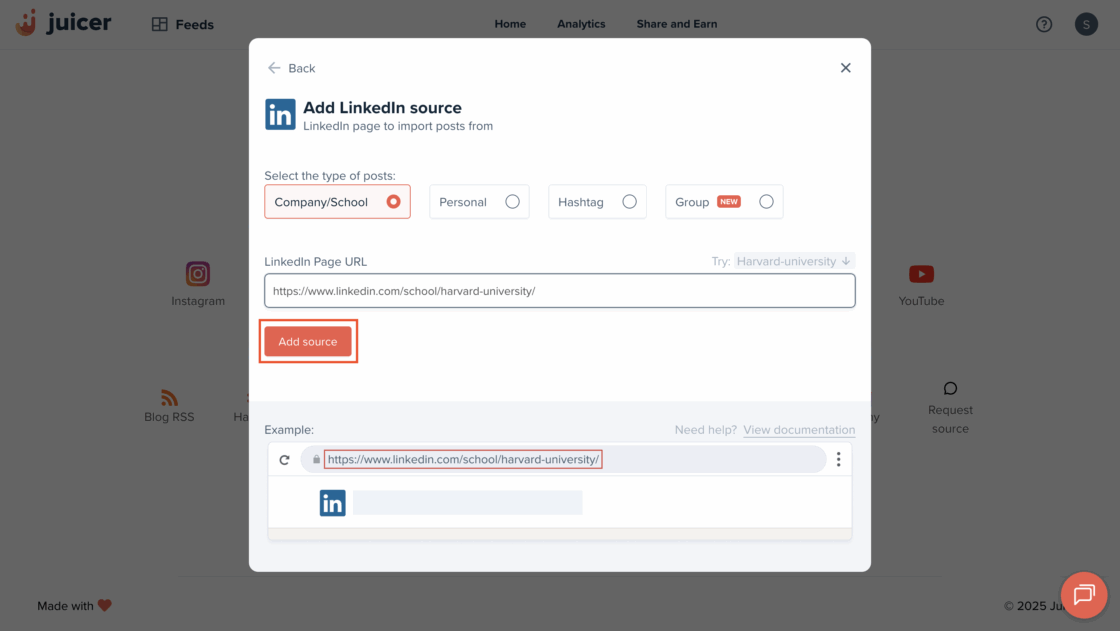 - Create a free account on Juicer.io and select LinkedIn as the social media source.