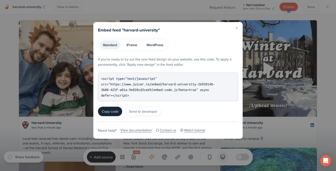 - Select your embed method from Standard, iFrame, or WordPress, depending on how you plan to add the feed to your website. Click on “Copy code” if you’re embedding the feed yourself or click on “Send to developer” if your team member will be taking over.