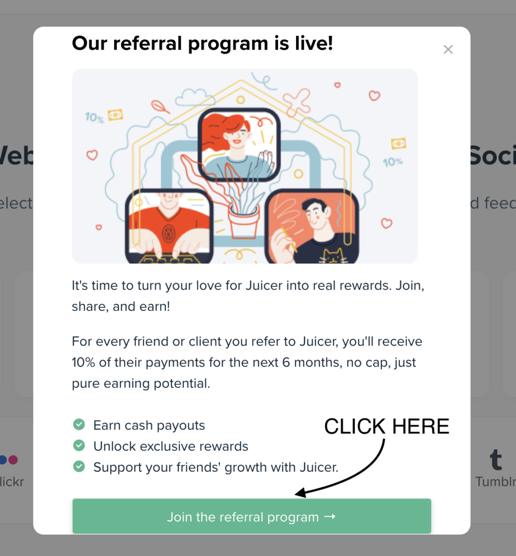 For every friend or client you refer to Juicer.io, you’ll receive 10% of their payments for the next 6 months – no cap, just pure earning potential. The commission is only earned when the referred customer actually pays for a plan.