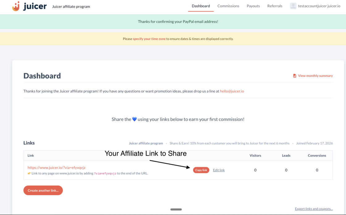 You’ll be asked to enter your PayPal email address where commissions will be paid out. Enter your PayPal email, or leave it blank if it’s the same as your Juicer.io account email. Click Confirm email to proceed.