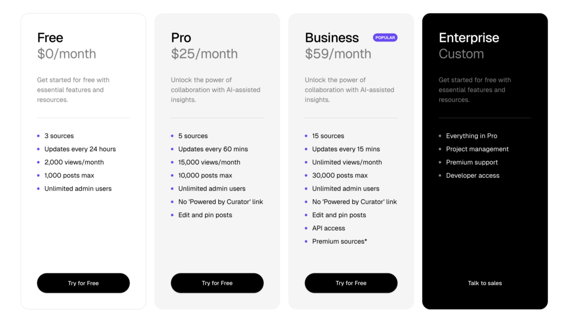 The professional plans start with the Pro plan ($25/month) which adds more sources, faster updates, editing, and removes branding, while the Business plan ($59/month) expands to even more sources, frequent refreshes, unlimited views, and API access. For larger needs, a custom Enterprise pricing tier adds tailored features, support, and project management options.