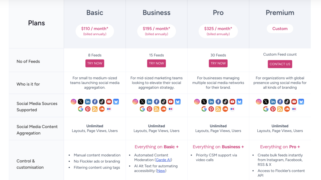 Flockler offers tiered monthly plans starting with Basic for small–mid teams ($110/month) with up to 8 social feeds, Business with automated moderation and AI tools, and Pro with more feeds and API access.