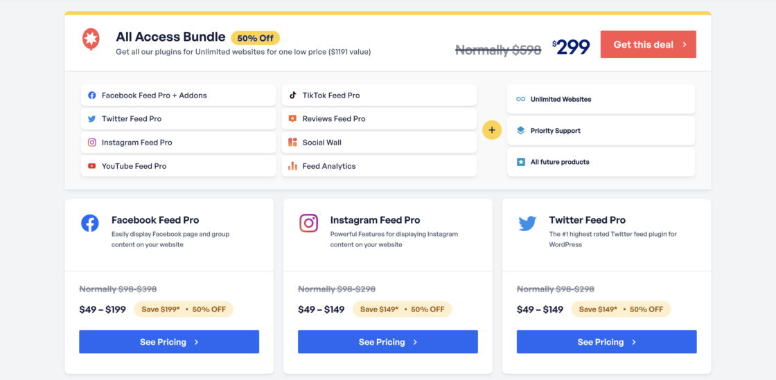 For broader needs, the All Access Bundle paid plan provides unlimited use of all Smash Balloon plugins on any number of websites for one yearly price ($299/year), including priority support and access to all future products. A 30-day refund policy is included so you can try the plugin risk-free before committing.